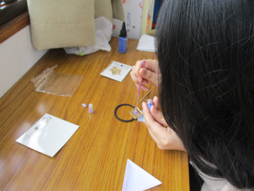初めにどんな感じの物を作るかを想像して、色や飾りつけを考え制作しました(*^-^*) 少しずつ色を付けてはレジンを固めて、飾りをつけました(^_-)-☆ 細かい作業も慎重に丁寧に行うことが出来ました( ^)o(^ ) 完成した作品にニコニコで満足な様子でした。次に作る形も決めたりして、 今後のレジン制作が楽しみの様子でした(^_-)-☆