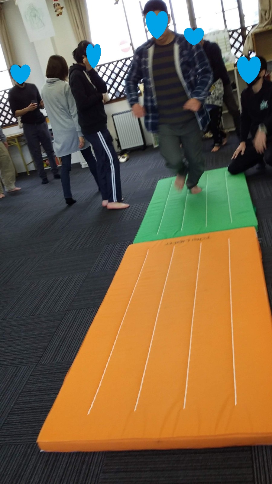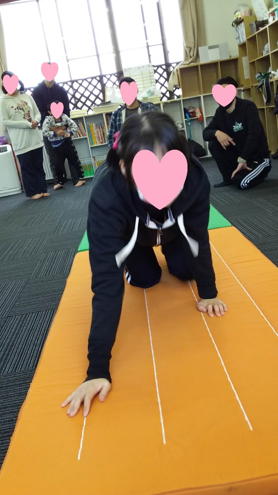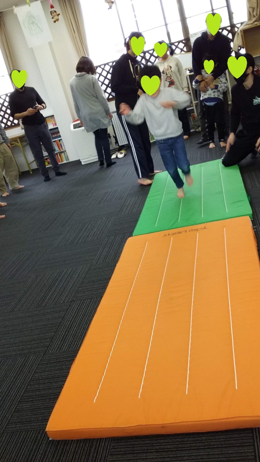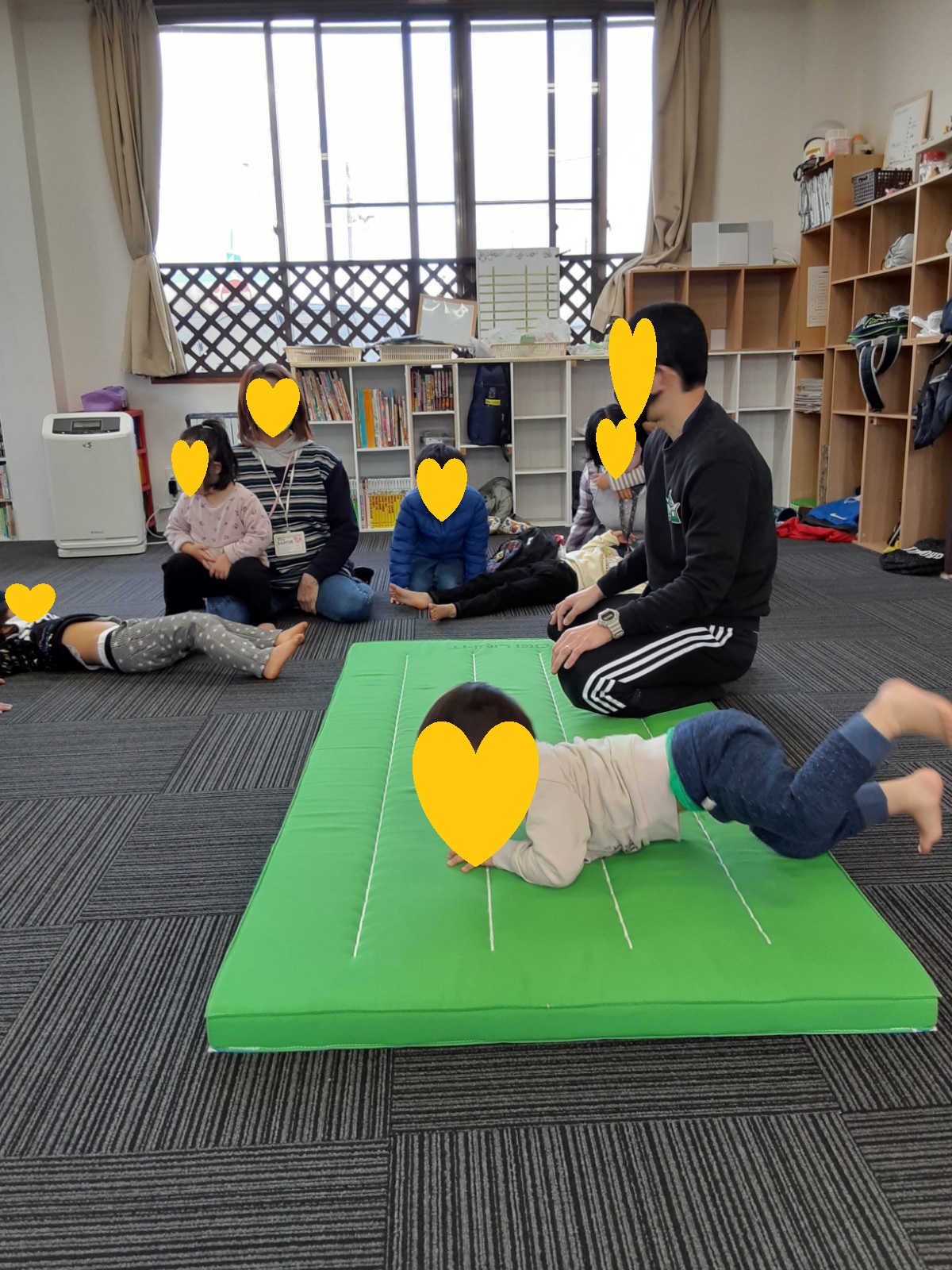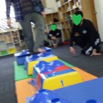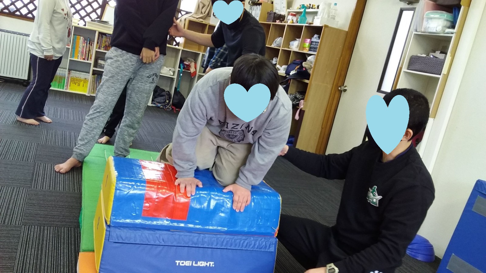 マット運動では、スタッフとコーチや子供たちも参加して足の間をくぐる運動をしました(^^♪