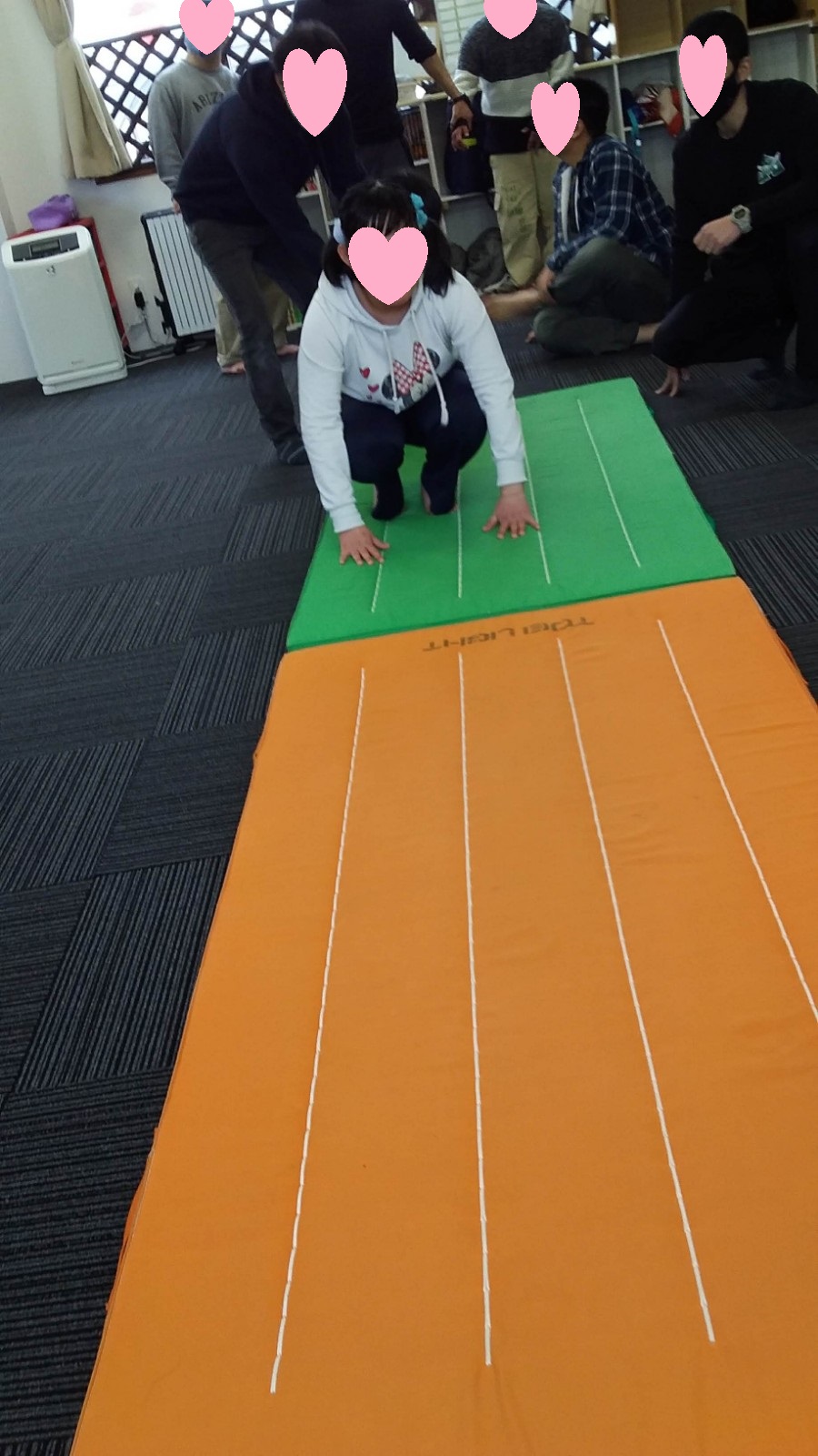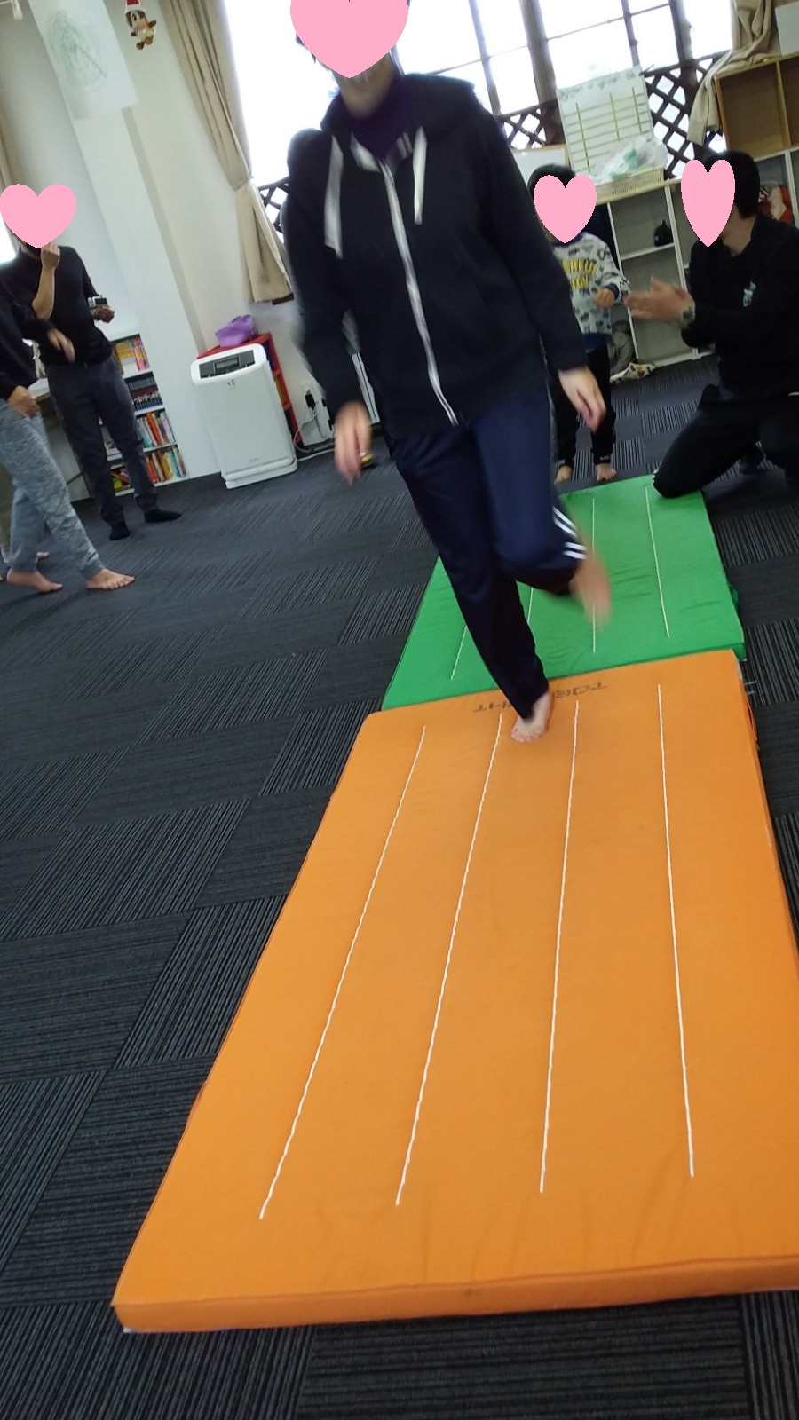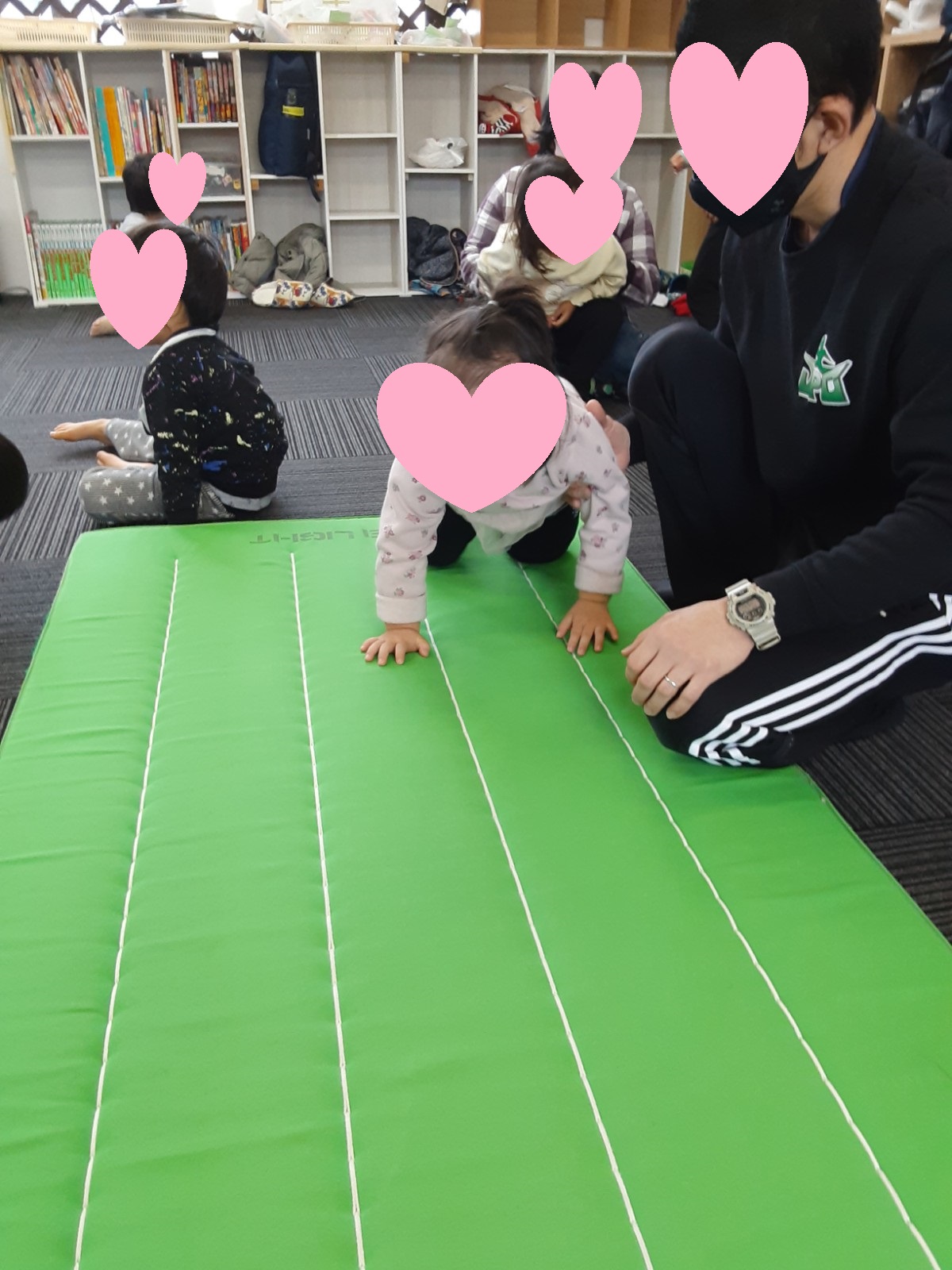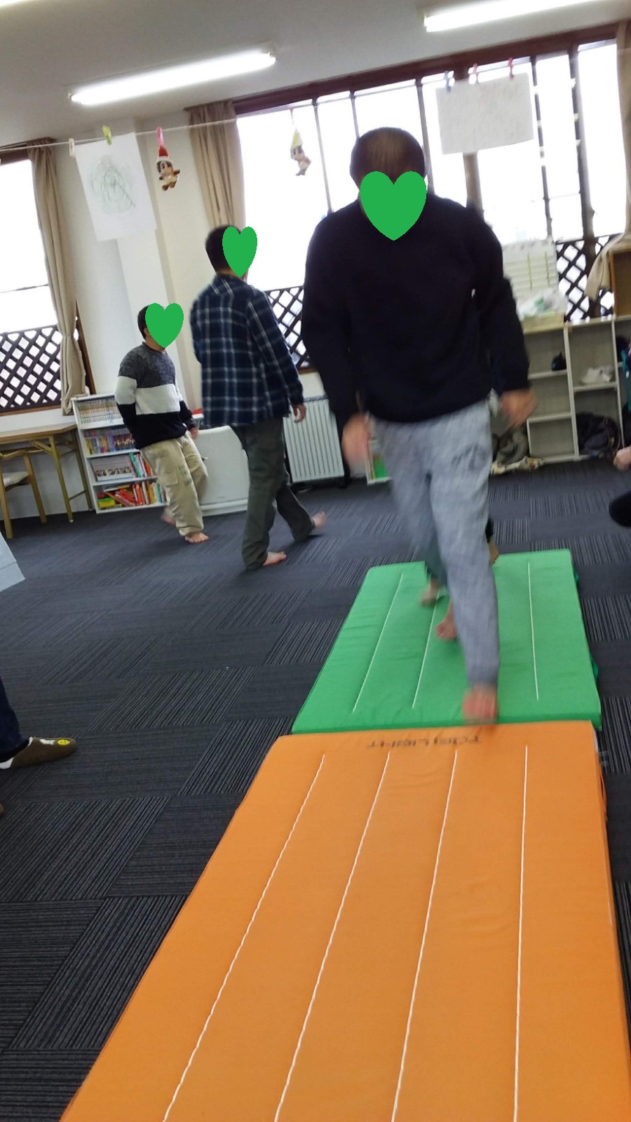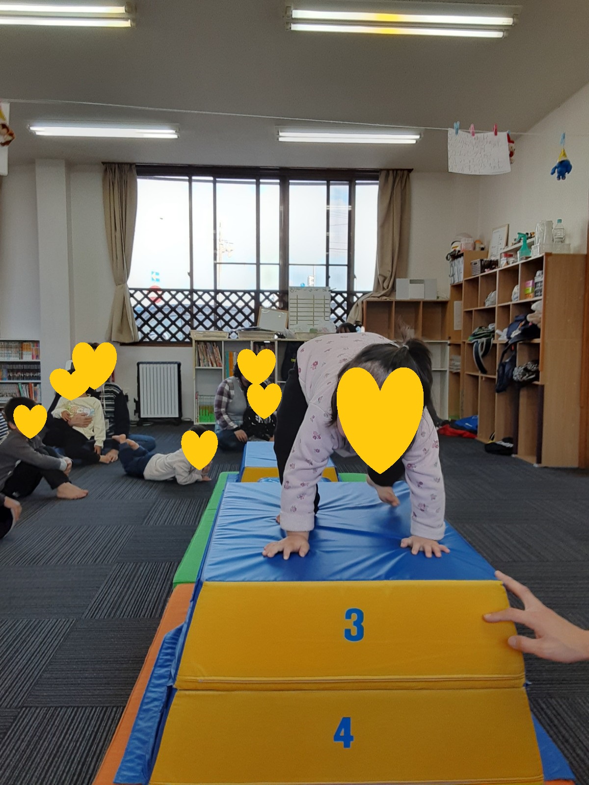 マット運動では、スタッフとコーチや子供たちも参加して足の間をくぐる運動をしました(^^♪