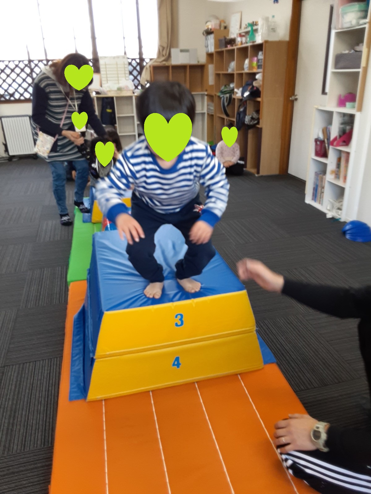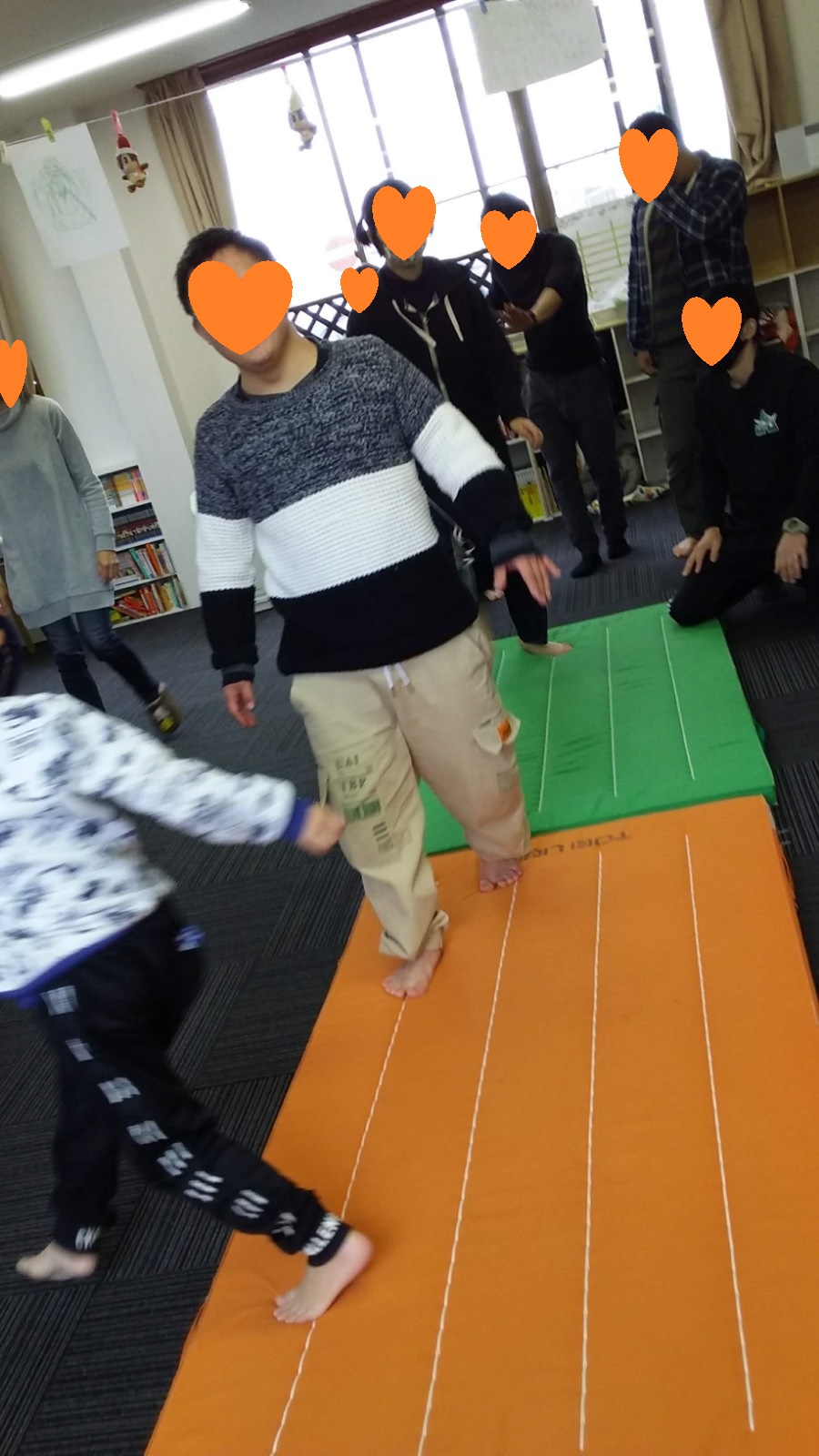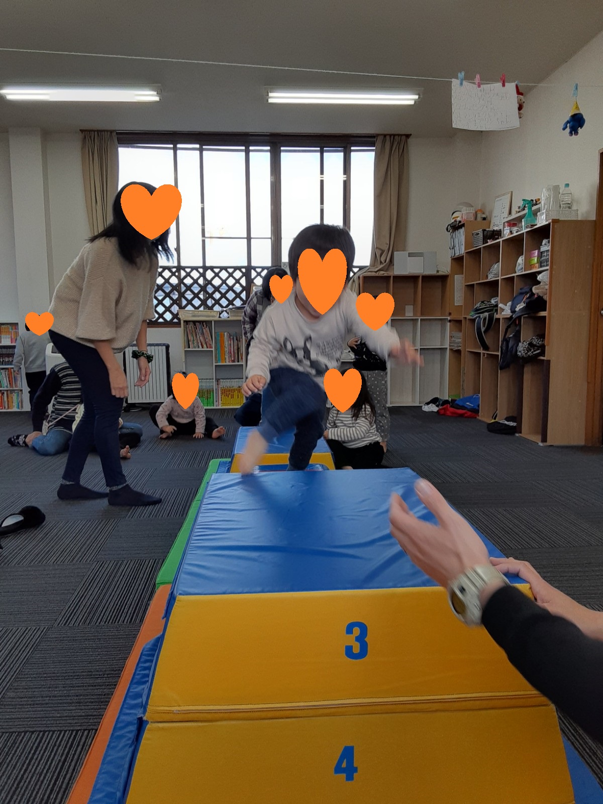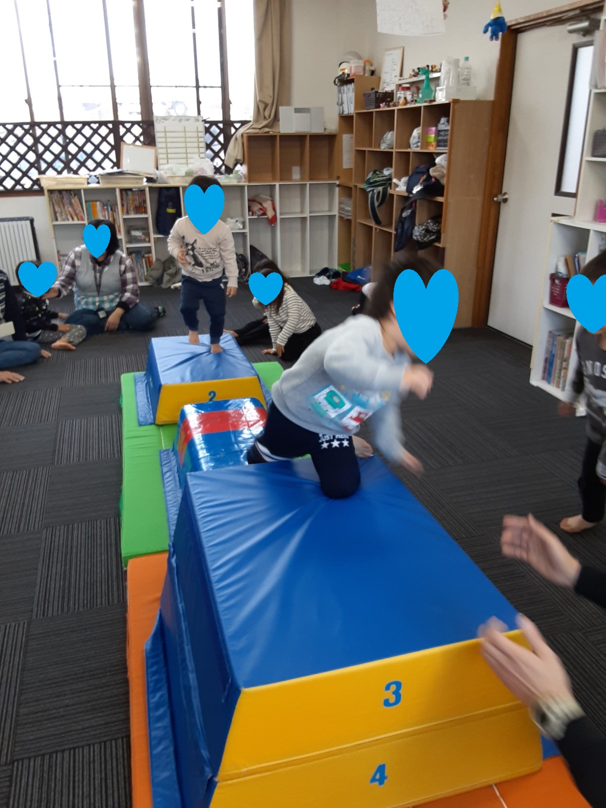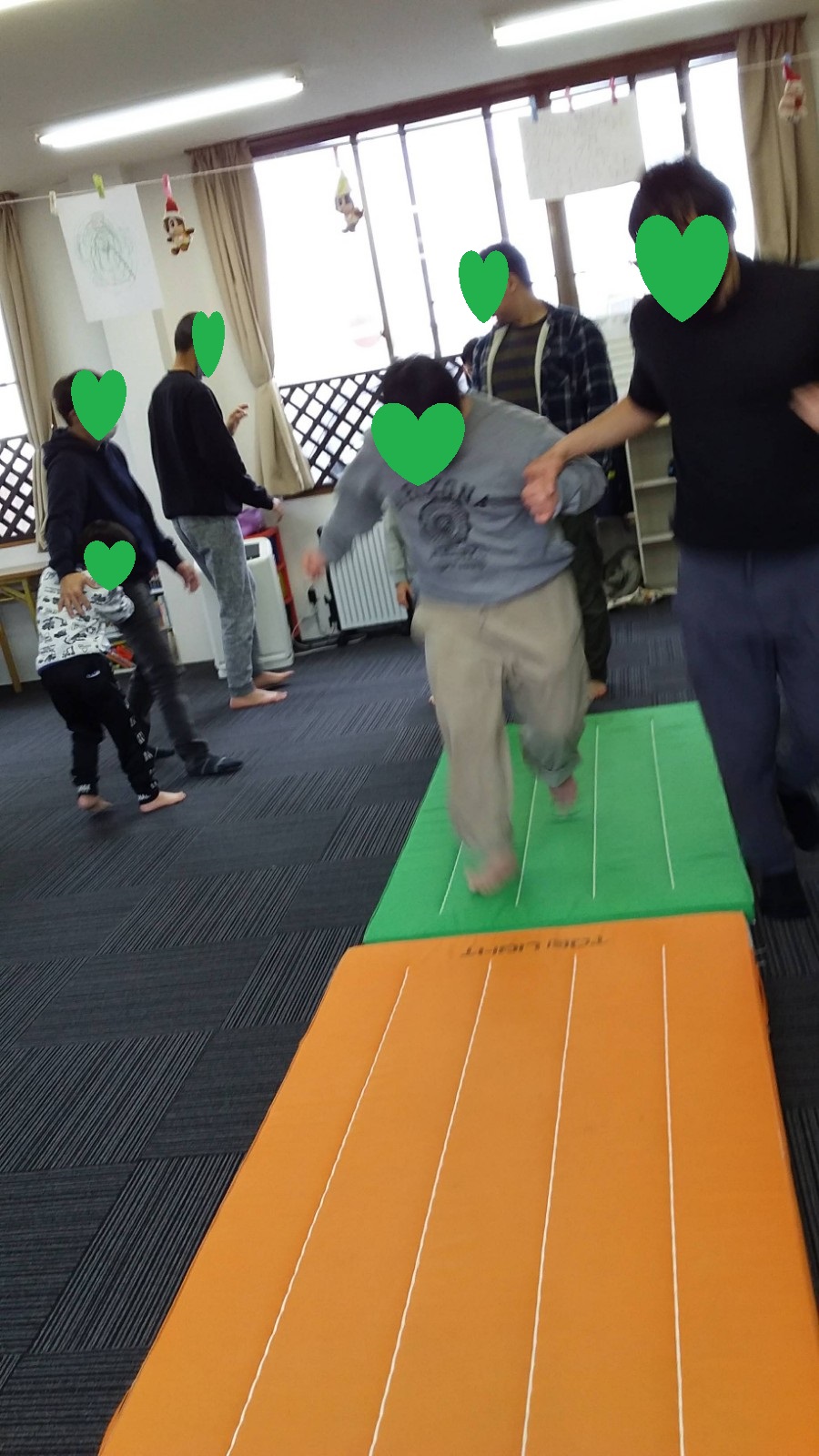 マット運動では、スタッフとコーチや子供たちも参加して足の間をくぐる運動をしました(^^♪