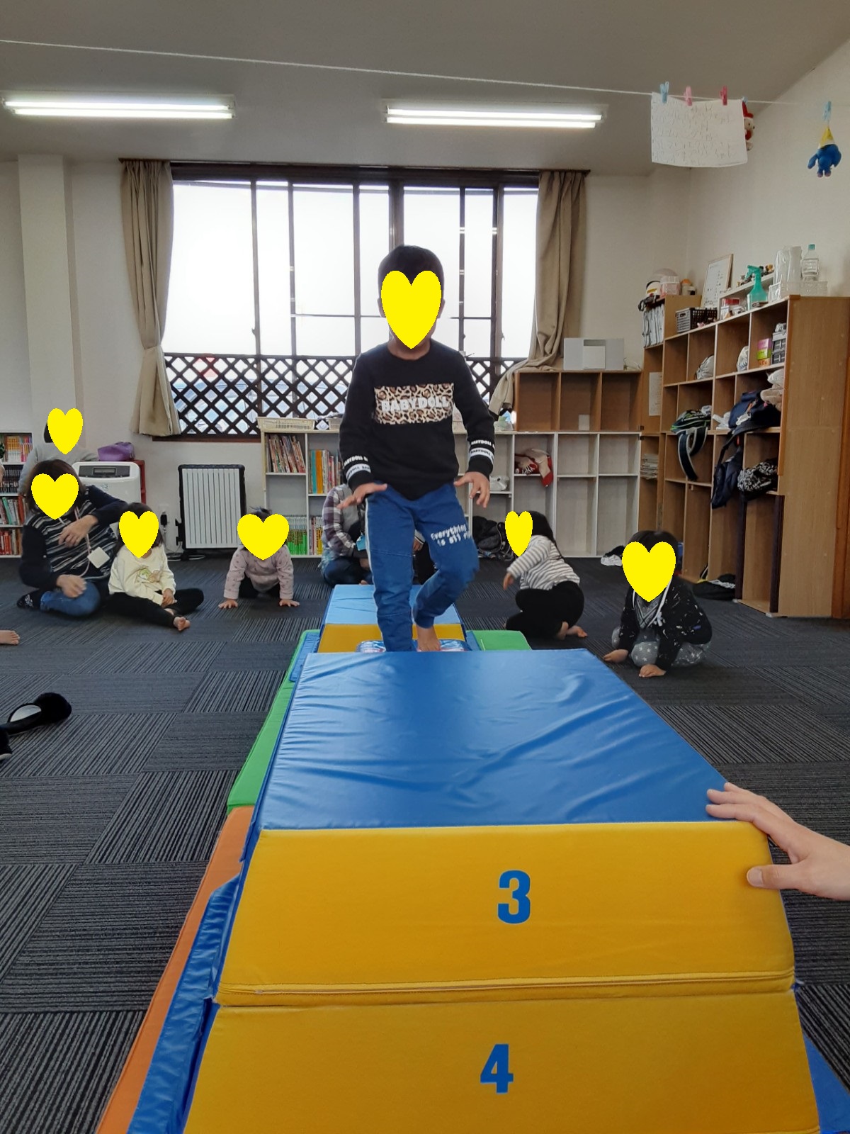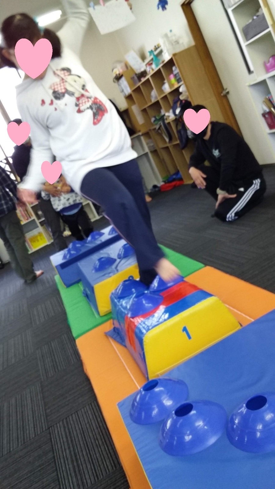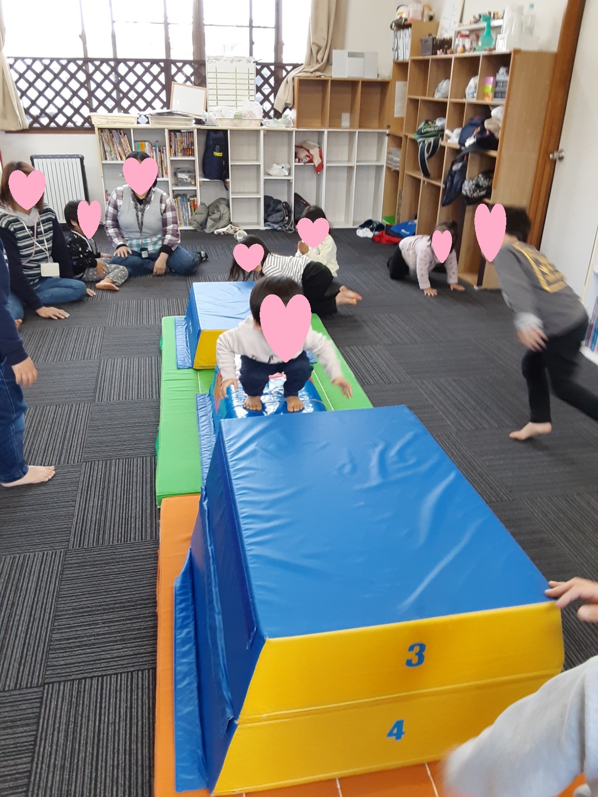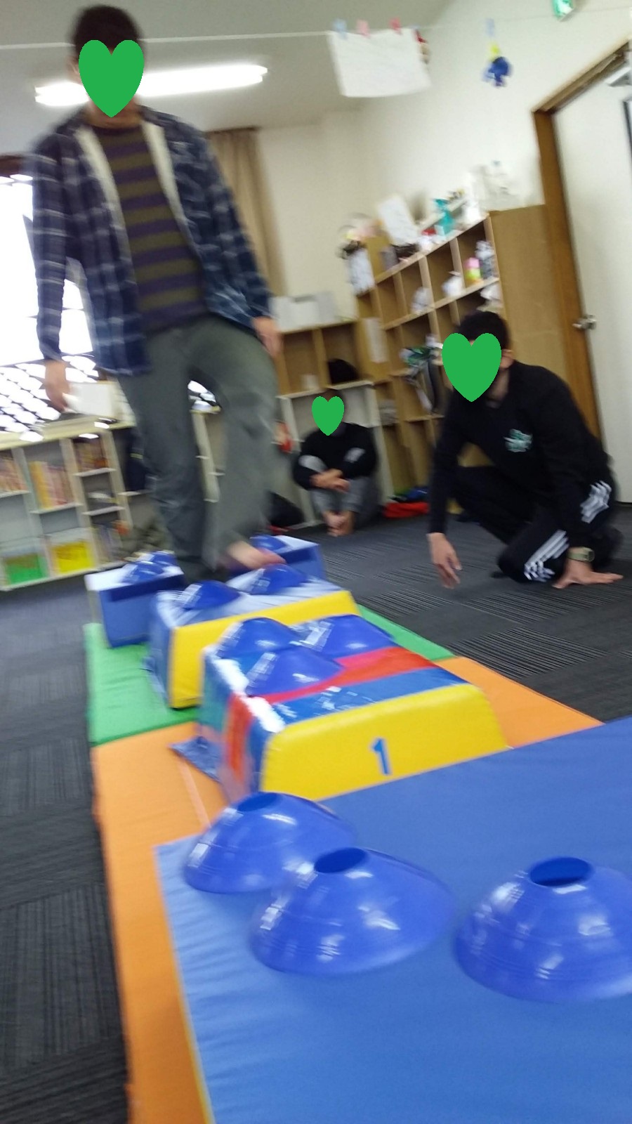 マット運動では、スタッフとコーチや子供たちも参加して足の間をくぐる運動をしました(^^♪
