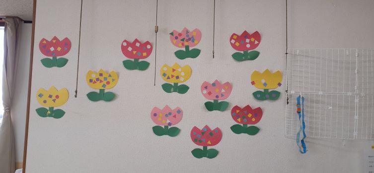 完成したチューリップ🌷を壁に飾ると嬉しそうな表情を見せてくれました(^_-)-☆