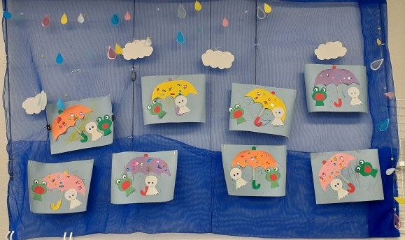 今回の創作活動では、「梅雨」の時期ですので厚紙や折り紙などを使って「梅雨」を表現しました 😛