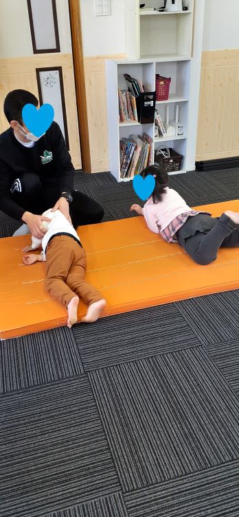 マットからはみ出ないように転がったり、膝歩き、手押し車などを行いました(^_-)-☆